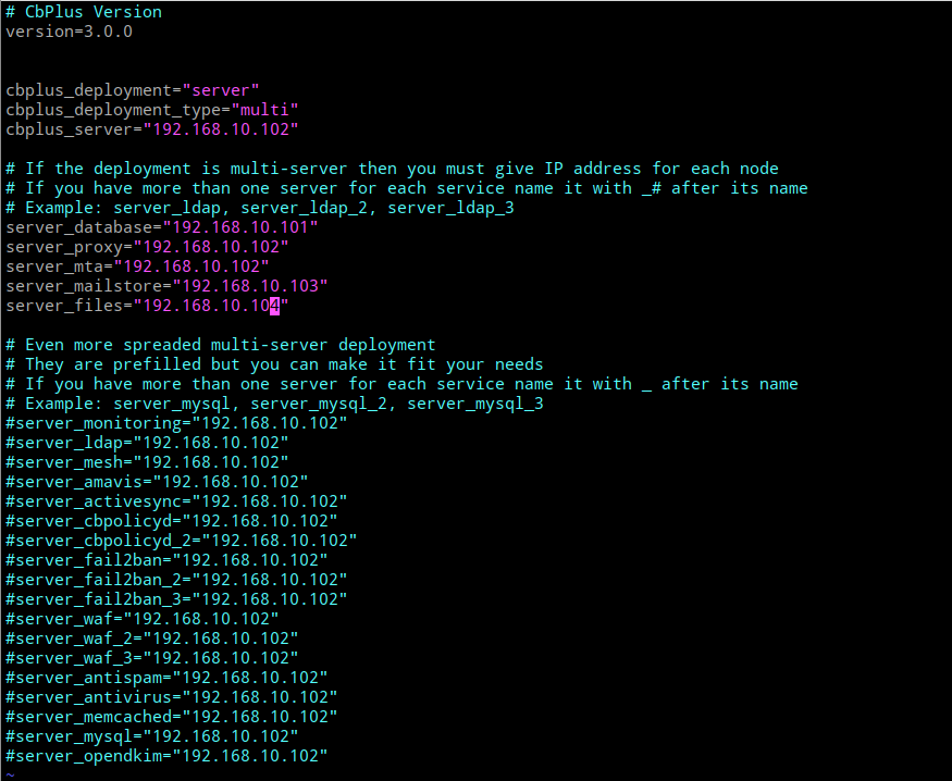 The image above shows an example of a default cbplus.conf file from a freshly installed CbPlus Server. In the first section, you’ll find the information provided during the installation: This is a CbPlus Server, in a Multi-Server deployment, and the server’s IP address.